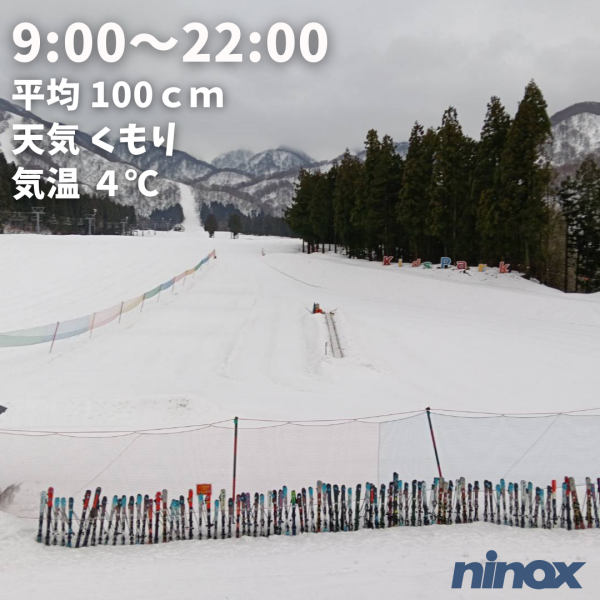 [平日] 09時00分~17時00分 [休日] 09時00分~17時00分 [ナイター] 16時00分~22時00分 [日中営業](予定)2025/12/18~2026/3/22 9:00~17:00 [ナイター営業](予定)2025/12/19~2026/3/15 16:00~21:00(22:00) ※毎週金・土曜日・1/11・2/22は22時まで。 ※上記以外の日曜日・祝日・12/29・12/30・1/1は21時まで。 ※ナイターの営業リフトは第1クワッドリフトとペアリフトとなります。 ※未就学児は保護者同伴でリフト無料。 |