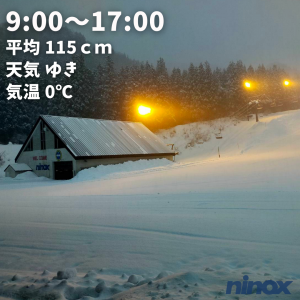 | 滑走状況 | 全面可能[◎] | 天気 | 小雪 | 気温 | 0℃ | 雪質 | 圧雪 | 積雪 | 115cm |