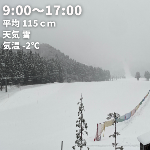 | 滑走状況 | 全面可能[◎] | 天気 | 雪 | 気温 | -2℃ | 雪質 | 圧雪 | 積雪 | 115cm |