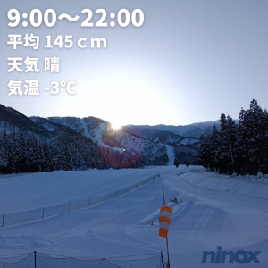 | 滑走状況 | 大部分可[○] | 天気 | 晴 | 気温 | -5℃ | 雪質 | 人工雪 | 積雪 | 35cm |