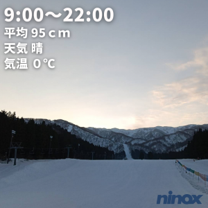| 滑走状態 | 全面可能[◎] | 天気 | 小雪 | 気温 | 0℃ | 雪質 | 圧雪 | 積雪 | 95cm |